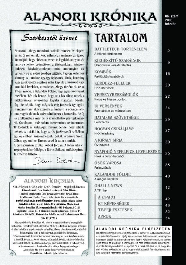 Alanori Krónika 86. (2003. február) - Tartalomjegyzék
