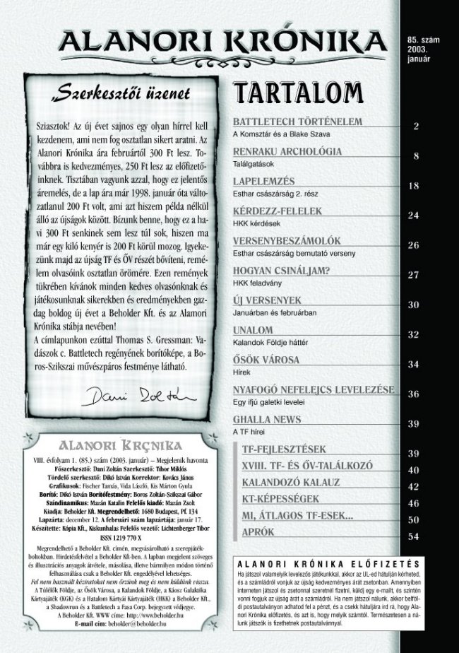Alanori Krónika 85. (2003. január) - Tartalomjegyzék