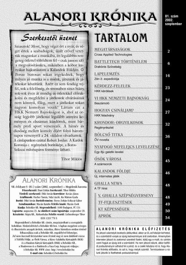 Alanori Krónika 81. (2002. szeptember) - Tartalomjegyzék