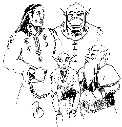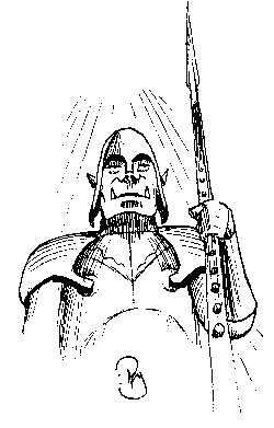 Egyikük fényes sisakot viselt, kezében hosszú dárdát tartott. A sisak alól két éles, hegyes szemfog meredt felfelé. Tömpe orra még jobban hangsúlyozta, hogy valamely ork istenség lehet. A másik szélső lény inkább nőt formázott. Lobogó, hosszú hajjal, hosszú ruhában állt ott, egy vastag, egyenes kardra támaszkodva. Maga a kard is hosszabb volt, mint akár Clashton, akár Verzechmimi. A középső... ő volt a legfélelmetesebb. Az egész arcát eltakaró sisak védte a fejét, s tetőtől talpig erős fémpáncélba öltözött. A páncélon keresztül is látszottak félelmetes izmai. Vastag, erős kezében egy buzogányt tartott.