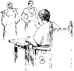 A terem végében kisebb ajtó következett. Belépve egy újabb folyosóra jutottak, ez azonban már nem volt olyan magas, olyan félelmetes, mint amin a nagyterembe jutottak. Mennyezetét olyan alacsonyra építették, hogy a két férfinak az az érzése támadt, meg kell hajtani a derekukat ahhoz, hogy be ne verjék a fejüket. A folyosóról újabb ajtók nyíltak mindkét oldalon, és szemben is. A kopott ruhás kinyitotta jobbról a második ajtót, és tisztelettudóan megvárta, amíg a két büszke tartású férfi belép az ajtón.