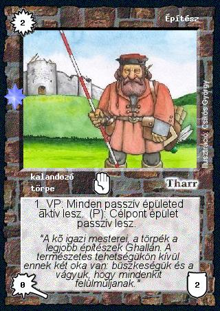 Kiadás: Ezüsthajnal Gyakoriság: gyakori Lapszín (isten): Tharr Típus: kalandozó Altípus: törpe Szöveg: 1 VP: Minden passzív épületed aktív lesz. (P): Célpont épület passzív lesz. Szinesítő szöveg: "A kő igazi mesterei, a törpék a legjobb építészek Ghallán. A természetes tehetségükön kívül ennek két oka van: büszkeségük és a vágyuk, hogy mindenkit felülmúljanak." Illusztráció: Csikós György