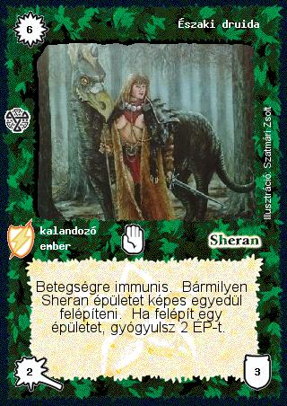 Kiadás: Isteni szövetség, Védnök 2023 Gyakoriság: nem gyakori Lapszín (isten): Sheran Típus: kalandozó Altípus: ember Szöveg: Betegségre immunis. Bármilyen Sheran épületet képes egyedül felépíteni. Ha felépít egy épületet, gyógyulsz 2 ÉP-t. Illusztráció: Szatmári Zsolt