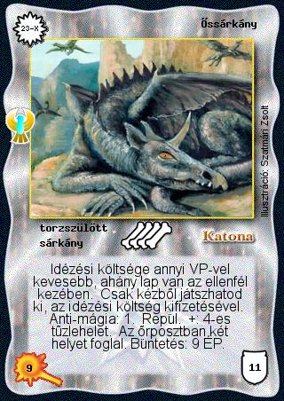 Kiadás: Ébredés Gyakoriság: ritka Lapszín (isten): Katona Klán Típus: torzszülött Altípus: sárkány Szöveg: Idézési költsége annyi VP-vel kevesebb, ahány lap van az ellenfél kezében. Csak kézből játszhatod ki, az idézési költség kifizetésével. Anti-mágia: 1. Repül. +: 4-es tűzlehelet. Az őrposztban két helyet foglal. Büntetés: 9 ÉP. Illusztráció: Szatmári Zsolt