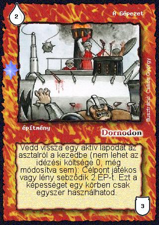Kiadás: Ezüsthajnal, Túlélők Földje, Védnök 2025 Gyakoriság: ritka Lapszín (isten): Dornodon Típus: építmény Szöveg: Vedd vissza egy aktív lapodat az asztalról a kezedbe (nem lehet az idézési költsége 0, még módosítva sem): Célpont játékos vagy lény sebződik 2 ÉP-t. Ezt a képességet egy körben csak egyszer használhatod. Illusztráció: Csikós György