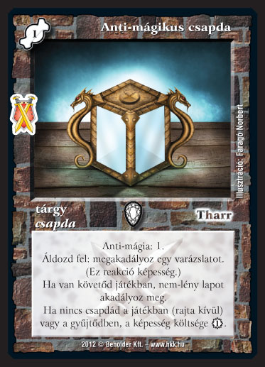 Kiadás: Istenek viadala Gyakoriság: ritka Lapszín (isten): Tharr Típus: tárgy Altípus: csapda Szöveg: Anti-mágia: 1. Áldozd fel: megakadályoz egy varázslatot. (Ez reakció képesség.) Ha van követőd játékban, nem-lény lapot akadályoz meg. Ha nincs csapdád a játékban (rajta kívül) vagy a gyűjtődben, a képesség költsége 1_VP. Illusztráció: Faragó Norbert