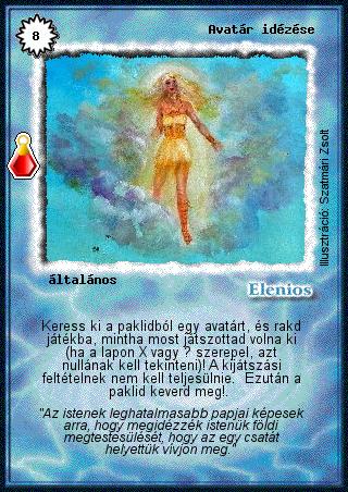Kiadás: Esthar Császárság Gyakoriság: ritka Lapszín (isten): Elenios Típus: általános Szöveg: Keress ki a paklidból egy avatárt, és rakd játékba, mintha most játszottad volna ki (ha a lapon X vagy ? szerepel, azt nullának kell tekinteni)! A kijátszási feltételnek nem kell teljesülnie. Ezután a paklid keverd meg!. Szinesítő szöveg: "Az istenek leghatalmasabb papjai képesek arra, hogy megidézzék istenük földi megtestesülését, hogy az egy csatát helyettük vívjon meg." Illusztráció: Szatmári Zsolt