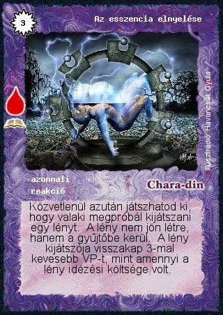 Kiadás: Vérmező (Zén) Gyakoriság: ritka Lapszín (isten): Chara-din Típus: azonnali Altípus: reakció Szöveg: Közvetlenül azután játszhatod ki, hogy valaki megpróbál kijátszani egy lényt. A lény nem jön létre, hanem a gyűjtőbe kerül. A lény kijátszója visszakap 3-mal kevesebb VP-t, mint amennyi a lény idézési költsége volt. Illusztráció: Havancsák Gyula