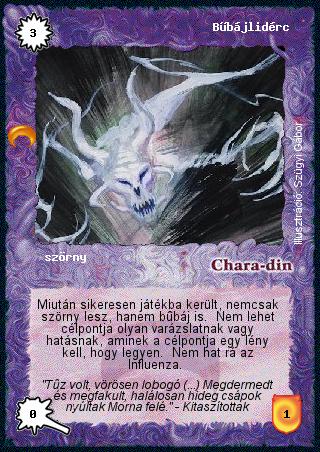 Kiadás: Chara-din visszatér Gyakoriság: nem gyakori Lapszín (isten): Chara-din Típus: szörny Szöveg: Miután sikeresen játékba került, nemcsak szörny lesz, hanem bűbáj is. Nem lehet célpontja olyan varázslatnak vagy hatásnak, aminek a célpontja egy lény kell, hogy legyen. Nem hat rá az Influenza. Szinesítő szöveg: "Tűz volt, vörösen lobogó (...) Megdermedt és megfakult, halálosan hideg csápok nyúltak Morna felé." - Kitaszítottak Illusztráció: