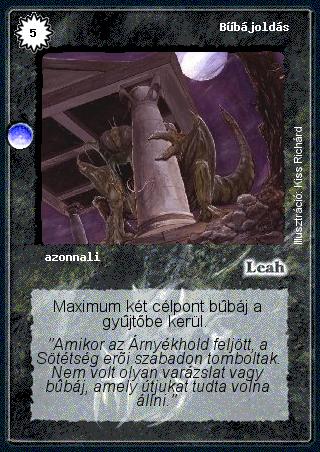Kiadás: Árnyékhold Gyakoriság: gyakori Lapszín (isten): Leah Típus: azonnali Szöveg: Maximum két célpont bűbáj a gyűjtőbe kerül. Szinesítő szöveg: "Amikor az Árnyékhold feljött, a Sötétség erői szabadon tomboltak. Nem volt olyan varázslat vagy bűbáj, amely útjukat tudta volna állni." Illusztráció: Kiss Richárd