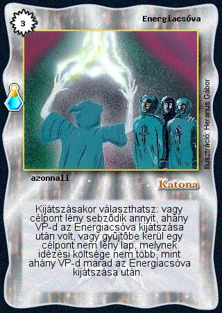 Kiadás: Esthar Császárság, Alappakli, 7. kiadás (Ősök Városa) Gyakoriság: ritka Lapszín (isten): Katona Klán Típus: azonnali Szöveg: Kijátszásakor választhatsz: vagy célpont lény sebződik annyit, ahány VP-d az Energiacsóva kijátszása után volt, vagy gyűjtőbe kerül egy célpont nem lény lap, melynek idézési költsége nem több, mint ahány VP-d marad az Energiacsóva kijátszása után. Illusztráció: Heranus Gábor