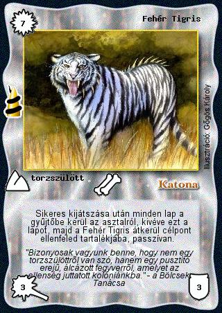 Kiadás: Rúvel hegy, Alappakli, 6. kiadás (Ősök Városa), Alappakli, 7. kiadás (Ősök Városa), Védnök 2025 Gyakoriság: ritka Lapszín (isten): Katona Klán Típus: torzszülött Szöveg: Sikeres kijátszása után minden lap a gyűjtőbe kerül az asztalról, kivéve ezt a lapot, majd a Fehér Tigris átkerül célpont ellenfeled tartalékjába, passzívan. Szinesítő szöveg: "Bizonyosak vagyunk benne, hogy nem egy torzszülöttről van szó, hanem egy pusztító erejű, álcázott fegyverről, amelyet az ellenség juttatott kolóniánkba." - a Bölcsek Tanácsa Illusztráció: Gőgös Károly