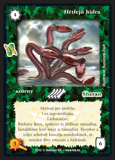 Kiadás: Kódos lapok Gyakoriság: ritka Lapszín (isten): Sheran Típus: szörny Altípus: - Szöveg: Aktívan jön játékba. 1-es regenerálódás. Láthatatlan. Bárhány lényt, épületet és játékost támadhat. Tartalékban levő lényt is támadhat. Ilyenkor a teljes sebzését kiosztja mindenkinek, és minden lény visszaüt a hidrának. Illusztráció: Ruzsinszki Zsolt