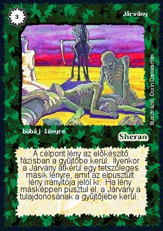 Kiadás: Alappakli, 1. kiadás, Alappakli, 2. kiadás, Alappakli, 3. kiadás, Alappakli, 4. kiadás, Túlélők Földje Gyakoriság: ritka Lapszín (isten): Sheran Típus: bűbáj lényre Szöveg: A célpont lény az előkészítő fázisban a gyűjtőbe kerül. Ilyenkor a Járvány átkerül egy tetszőleges másik lényre, amit az elpusztult lény irányítója jelöl ki. Ha lény másképpen pusztul el, a Járvány a tulajdonosának a gyűjtőjébe kerül. Illusztráció: Dorin Damaschin