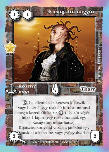 Szöveg: (K), ha ellenfeled sikeresen kijátszik vagy használ egy reakció forrást, mutasd meg a kezedből: kapsz 1_VP-t, és kör végén húzz 1 lapot (egy reakcióra csak egy Kasug-dint mutathatsz). Kijátszásakor vedd vissza a játékból egy moádat a kezedbe, vagy gyógyulsz 4-et.