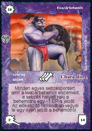 Kiadás: Isteni szövetség Gyakoriság: ritka Lapszín (isten): Chara-din Típus: szörny Altípus: gólem Szöveg: Minden egyes sebzéspontért, amit a kvazárbehemót elszenved, a sebzés helyett rakj a behemótra egy -1 ÉP-s jelzőt. Az előkészítő fázisodban vegyél le egy ilyen jelzőt a behemótról. Illusztráció: Gőgös Károly