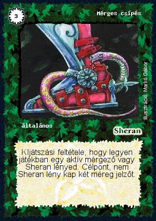 Kiadás: Alappakli, 3. kiadás, Alappakli, 4. kiadás Gyakoriság: gyakori Lapszín (isten): Sheran Típus: általános Szöveg: KIjátszási feltétele, hogy legyen játékban egy aktív mérgező vagy Sheran lényed. Célpont, nem Sheran lény kap két méreg jelzőt. Illusztráció: Markó Gábor
