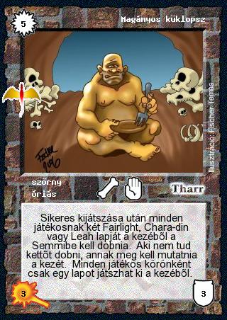 Kiadás: Sárkánymágia Gyakoriság: ritka Lapszín (isten): Tharr Típus: szörny Altípus: óriás Szöveg: Sikeres kijátszása után minden játékosnak két Fairlight, Chara-din vagy Leah lapját a kezéből a Semmibe kell dobnia. Aki nem tud kettőt dobni, annak meg kell mutatnia a kezét. Minden játékos körönként csak egy lapot játszhat ki a kezéből. Illusztráció: Fischer Tamás