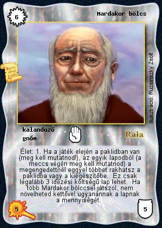 Kiadás: Legendák Völgye Gyakoriság: ultra ritka Lapszín (isten): Raia Típus: kalandozó Altípus: gnóm Szöveg: Élet: 1. Ha a játék elején a paklidban van (meg kell mutatnod!), az egyik lapodból (a meccs végén meg kell mutatnod) a megengedettnél eggyel többet rakhatsz a paklidba vagy a kiegészítőbe. Ez csak legalább 3 idézési költségű lap lehet. Ha több Mardakor bölccsel játszol, nem növelheted kettővel ugyanannak a lapnak a mennyiségét. Illusztráció: Ruzsinszki Zsolt