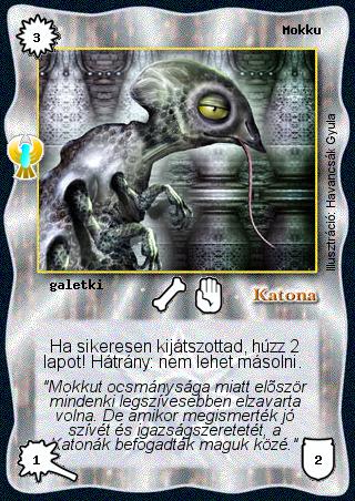 Kiadás: Ébredés, Alappakli, 7. kiadás (Ősök Városa) Gyakoriság: ritka Lapszín (isten): Katona Klán Típus: galetki Szöveg: Ha sikeresen kijátszottad, húzz 2 lapot! Hátrány: nem lehet másolni. Szinesítő szöveg: "Mokkut ocsmánysága miatt először mindenki legszívesebben elzavarta volna. De amikor megismerték jó szívét és igazságszeretetét, a Katonák befogadták maguk közé." Illusztráció: Havancsák Gyula