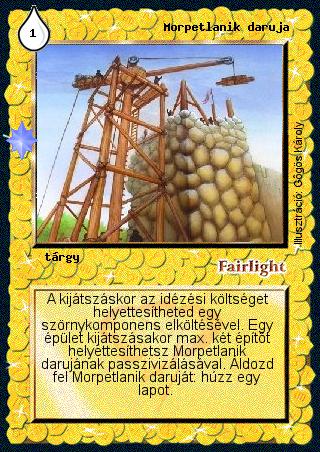 Kiadás: Ezüsthajnal, Túlélők Földje Gyakoriság: gyakori Lapszín (isten): Fairlight Típus: tárgy Szöveg: A kijátszáskor az idézési költséget helyettesítheted egy szörnykomponens elköltésével. Egy épület kijátszásakor max. két építőt helyettesíthetsz Morpetlanik darujának passzivizálásával. Áldozd fel Morpetlanik daruját: húzz egy lapot. Illusztráció: Gőgös Károly
