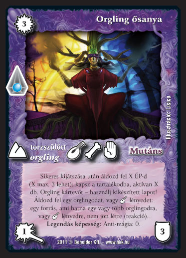 Kiadás: Zanszilánkok Gyakoriság: nem gyakori Lapszín (isten): Mutáns Klán Típus: torzszülött Altípus: orgling Szöveg: Sikeres kijátszása után áldozd fel X ÉP-d (X max. 3 lehet): kapsz a tartalékodba, aktívan X db. Orgling kártevőt - használj kikészített lapot! Áldozd fel egy orglingodat, vagy _legendás lényedet: egy forrás, ami hatna egy vagy több orglingodra, vagy _legendás lényedre, nem jön létre (reakció). Legendás képesség: Anti-mágia: 0. Illusztráció: Hamza Pál