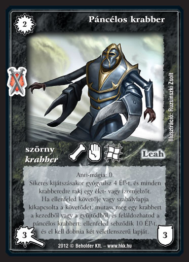 Kiadás: Istenek viadala Gyakoriság: nem gyakori Lapszín (isten): Leah Típus: szörny Altípus: krabber Szöveg: Anti-mágia: 0. Sikeres kijátszásakor gyógyulsz 4 ÉP-t, és minden krabberedre rakj egy élet- vagy izomjelzőt. Ha ellenfeled követője vagy szabálylapja kikapcsolta a követődet, mutass meg egy krabbert a kezedből vagy a gyűjtődből, és áldozd fel a páncélos krabbert: ellenfeled sebződik 10 ÉP-t, és el kell dobnia két véletlenszerű lapját. Illusztráció: Ruzsinszki Zsolt