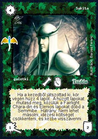 Kiadás: Sárkánymágia Gyakoriság: ritka Lapszín (isten): Tudós Klán Típus: galetki Szöveg: Ha a kezedből játszottad ki, kör végén húzz 4 lapot. A húzott lapokat mutasd meg, közülük a Fairlight, Chara-din és Elenios lapokat dobd a Semmibe. Hátrány: Nem lehet másolni, idézési költségét csökkenteni, és kézbe visszavenni. Illusztráció: Baross Ferenc
