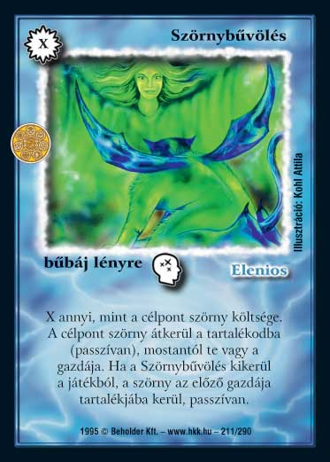 Kiadás: Alappakli, 1. kiadás, Alappakli, 3. kiadás, Alappakli, 4. kiadás, Védnök 2021, Túlélők Földje Gyakoriság: ritka Lapszín (isten): Elenios Típus: bűbáj lényre Szöveg: Költsége annyi, mint a célpont szörny alap idézési költsége. Egy ellenfél célpont szörnye átkerül a te tartalékodba (passzívan), mostantól te vagy a gazdája. Ha a szörnybűvölés kikerül a játékból, a szörny az eredeti gazda tartalékjába kerül, passzívan. Illusztráció: Kohl Attila