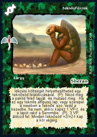 Kiadás: Sárkánymágia Gyakoriság: nem gyakori Lapszín (isten): Sheran Típus: tárgy Szöveg: Idézési költségét helyettesítheted egy teknősöd feláldozásával. (P): Nézd meg a paklid felső lapját, és mutasd meg. Ha ez egy teknős altípusú lap, vagy szerepel a nevében a 'teknős' szó, vedd a kezedbe, ha nem, akkor kapsz 1 VP-t, és a lapot rakd a Semmibe. (P), 3 VP, áldozd fel: Minden teknősöd +2/+2-t kap a kör végéig. Illusztráció: Ruzsinszki Zsolt