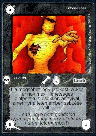 Kiadás: Alappakli, 1. kiadás, Alappakli, 2. kiadás, Alappakli, 3. kiadás, Alappakli, 4. kiadás Gyakoriság: nem gyakori Lapszín (isten): Leah Típus: szörny Szöveg: Ha megsebez egy játékost, akkor annak max. lehetséges életpontja is csökken annyival, amennyi a tetemember sebzése volt. Szinesítő szöveg: Leah, ugye nem gondolod komolyan, hogy meg kell ölnöm három tetemembert? Illusztráció: Nagy Viktória, Fischer Tamás