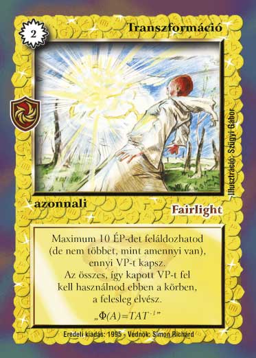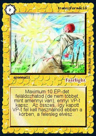 Kiadás: Alappakli, 1. kiadás, Védnök 2021 Gyakoriság: ritka Lapszín (isten): Fairlight Típus: azonnali Szöveg: Maximum 10 ÉP-det feláldozhatod (de nem többet, mint amennyi van), ennyi VP-t kapsz. Az összes, így kapott VP-t fel kell használnod ebben a körben, a felesleg elvész. Illusztráció: Kerekes Ilona