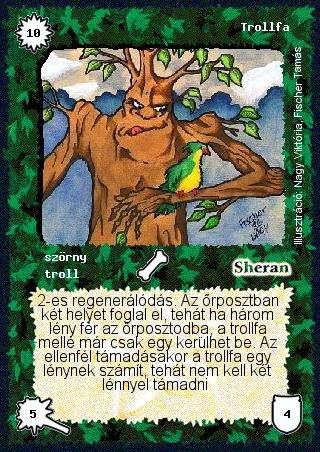Kiadás: Alappakli, 1. kiadás, Alappakli, 2. kiadás, Alappakli, 3. kiadás, Alappakli, 4. kiadás Gyakoriság: ritka Lapszín (isten): Sheran Típus: szörny Altípus: troll Szöveg: 2-es regenerálódás. Az őrposztban két helyet foglal el, tehát ha három lény fér az őrposztodba, a trollfa mellé már csak egy kerülhet be. Az ellenfél támadásakor a trollfa egy lénynek számít, tehát nem kell két lénnyel támadni Illusztráció: Nagy Viktória, Fischer Tamás