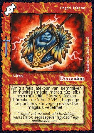 Kiadás: Hőskorszak Gyakoriság: ritka Lapszín (isten): Dornodon Típus: tárgy Szöveg: Amíg a fétis játékban van, semmilyen immunitás (mágia, méreg, tűz, stb) nem működik. Bármely játékos bármikor elkölthet 2 VP-t, hogy egy célpont lény kör végéig elveszítse mágikus védelmét. Szinesítő szöveg: "Urgod volt az első, aki kizárólag varázslatok segítségével legyőzőtt egy acélkolosszust." Illusztráció: Lipták László
