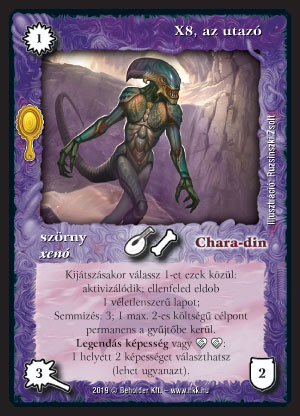 Kiadás: Tükördimenzió Gyakoriság: ritka Lapszín (isten): Chara-din Típus: szörny Altípus: xenó Szöveg: Kijátszásakor válassz 1-et ezek közül: aktivizálódik; ellenfeled eldob 1 véletlenszerű lapot; Semmizés: 3; 1 max. 2-es költségű célpont permanens a gyűjtőbe kerül. Legendás képesség vagy _etnikum _etnikum: 1 helyett 2 képességet választhatsz (lehet ugyanazt). Illusztráció: Ruzsinszki Zsolt