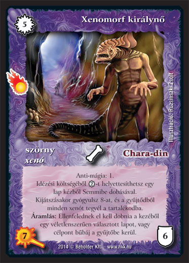 Kiadás: Mágusok Alkonya Gyakoriság: ritka Lapszín (isten): Chara-din Típus: szörny Altípus: xenó Szöveg: Anti-mágia: 1. Idézési költségéből 2_VP-t helyettesíthetsz egy lap kézből Semmibe dobásával. Kijátszásakor gyógyulsz 8-at, és a gyűjtődből minden xenót tegyél a tartalékodba. ?ramlás: Ellenfelednek el kell dobnia a kezéből egy véletlenszerűen választott lapot, vagy célpont bűbáj a gyűjtőbe kerül. Illusztráció: Ruzsinszki Zsolt