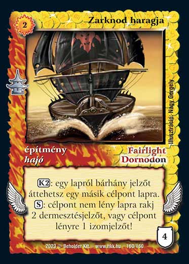 Kiadás: Császárváros Gyakoriság: nem gyakori Lapszín (isten): Fairlight-Dornodon Típus: építmény Altípus: hajó Szöveg: (K2): egy lapról bárhány jelzőt áttehetsz egy másik célpont lapra. (S): célpont nem lény lapra rakj 2 dermesztésjelzőt, vagy célpont lényre rakj 1 izomjelzőt! (K2): egy lapról bárhány jelzőt áttehetsz egy másik célpont lapra. (S): célpont nem lény lapra rakj 2 dermesztésjelzőt, vagy célpont lényre 1 izomjelzőt! Illusztráció: Nagy Gergely