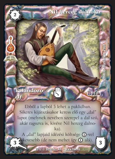 Szöveg: Ebb?l a lapból 5 lehet a paklidban. Sikeres kijátszásakor keress el? egy "dal" lapot (melynek nevében szerepel a dal szó, akár ragozva is, kivéve Nil herceg dalnoka). A "dal" lapjaid idézési költsége 1_VP-vel kevesebb (de nem mehet így 1_VP alá).