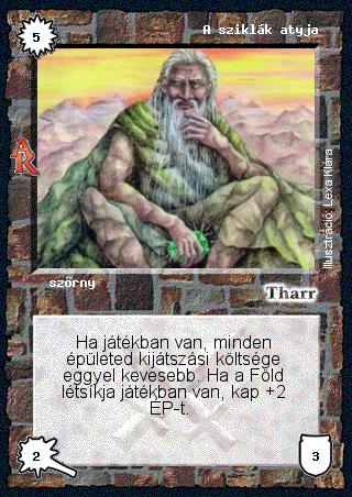Kiadás: Alanori Krónika Gyakoriság: ritka Lapszín (isten): Tharr Típus: szörny Szöveg: Ha játékban van, minden épületed kijátszási költsége eggyel kevesebb. Ha a Föld létsíkja játékban van, kap +2 ÉP-t. Illusztráció: Lexa Klára