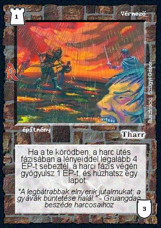 Kiadás: Alanori Krónika Gyakoriság: ritka Lapszín (isten): Tharr Típus: építmény Szöveg: Ha a te körödben, a harc ütés fázisában a lényeiddel legalább 4 ÉP-t sebeztél, a harci fázis végén gyógyulsz 1 ÉP-t, és húzhatsz egy lapot. Szinesítő szöveg: "A legbátrabbak elnyerik jutalmukat; a gyávák büntetése halál." - Gruangdag beszéde harcosaihoz Illusztráció: