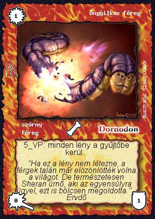 Kiadás: Alanori Krónika Gyakoriság: ritka Lapszín (isten): Dornodon Típus: szörny Altípus: féreg Szöveg: 5 VP: minden lény a gyűjtőbe kerül. Szinesítő szöveg: "Ha ez a lény nem létezne, a férgek talán már elözönlötték volna a világot. De természetesen Sheran úrnő, aki az egyensúlyra ügyel, ezt is bölcsen megoldotta." - Ervdő Illusztráció: Szász Gábor