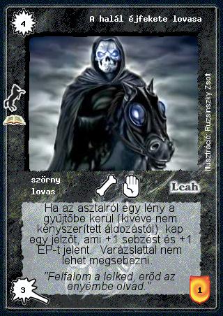 Kiadás: Az apokalipszis lovasai (Zén) Gyakoriság: ritka Lapszín (isten): Leah Típus: szörny Altípus: lovas Szöveg: Ha az asztalról egy lény a gyűjtőbe kerül (kivéve nem kényszerített áldozástól), kap egy jelzőt, ami +1 sebzést és +1 ÉP-t jelent. Varázslattal nem lehet megsebezni. Szinesítő szöveg: "Felfalom a lelked, erőd az enyémbe olvad." Illusztráció: Ruzsinszki Zsolt