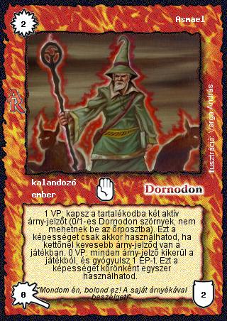 Kiadás: Alanori Krónika Gyakoriság: ritka Lapszín (isten): Dornodon Típus: kalandozó Altípus: ember Szöveg: 1 VP: kapsz a tartalékodba két aktív árny-jelzőt (0/1-es Dornodon szörnyek, nem mehetnek be az őrposztba). Ezt a képességet csak akkor használhatod, ha kettőnél kevesebb árny-jelződ van a játékban. 0 VP: minden árny-jelző kikerül a játékból, és gyógyulsz 1 ÉP-t. Ezt a képességet körönként egyszer használhatod. Szinesítő szöveg: "Mondom én, bolond ez! A saját árnyékával beszélget!" Illusztráció: Varga András