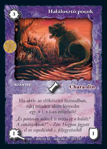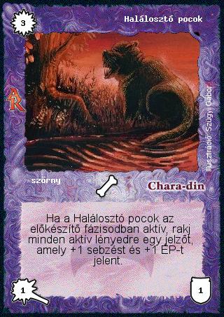 Kiadás: Alanori Krónika, Túlélők Földje Gyakoriság: ritka Lapszín (isten): Chara-din Típus: szörny Szöveg: Ha a Halálosztó pocok az előkészítő fázisodban aktív, rakj minden aktív lényedre egy jelzőt, amely +1 sebzést és +1 ÉP-t jelent. Illusztráció: